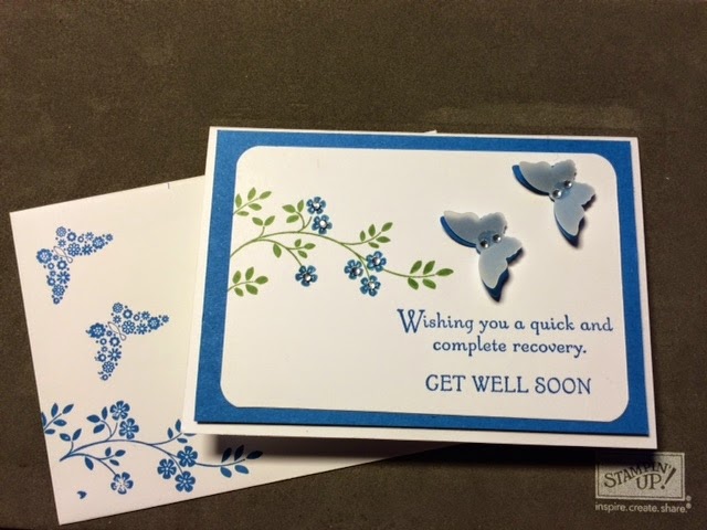 Dit is een kaart in Whispering White, ook weer de card en envelop, te koop in setjes van 10 stuks. Nogmaals de tak ingekleurd en voor de helft afgedrukt. Ook deze tekst zit bij de set en mooi afgemaakt met de vlinderpunch. De envelop heb ik niet vergeten.